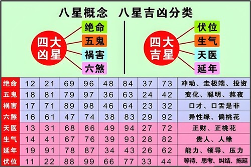 根据数字能量学,八星数字分为四吉星(生气、天医、延年、伏位)和四凶星(六煞、五鬼、绝命、祸害)。吉星通常代表正面的能量,如财富、健康、事业顺利等;而凶星则可能带来负面的影响,如财运不稳定、感情不和、健康问题等。