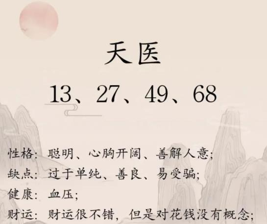 天医磁场代表正财和正桃花,象征着财富、婚姻和感情的顺利发展。它通常与数字13、31、68、86、49、94、72、27相关联,这些数字组合被认为是能量最强的天医磁场。