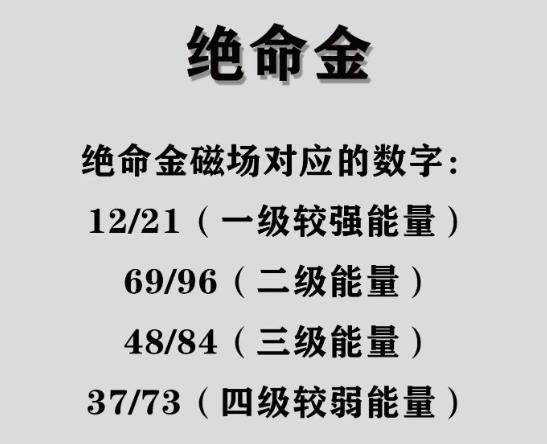 绝命磁场是数字能量学中的一种磁场组合,其代表的数字组合包括12、21、69、96、48、84、37、73。这种磁场通常具有强烈的能量波动和不稳定的特点,常与破财、冲动、情绪化以及健...查看更多