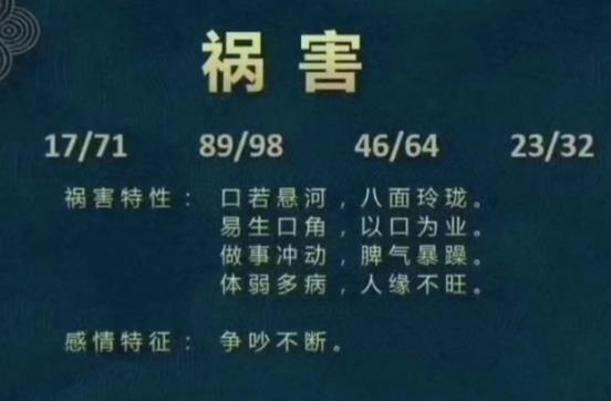 祸害磁场是由特定数字组合形成的能量场,这些组合通常包括17、71、89、46、64、23等数字。祸害磁场的核心特征是口才出众、善于言辞,但容易因言语不当引发争执或是非,从而导致财运...查看更多