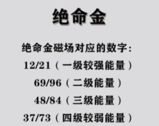 绝命磁场的典型结尾数字组合包括:12、21、69、96、48、84、73、37。这些组合均被归类为凶星磁场,能量强烈且波动性大。