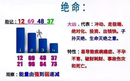 绝命星也不一定是凶星,往往大老板、企业家手机号都有绝命星,这种人往往艺高人胆大,手机号数字中组合好了“绝命星”都能挣大钱,组合不好则破财、亏损!钱财流失厉害,甚至别人借了自己钱不愿意归还。