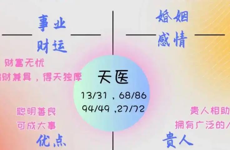 天医磁场结尾(如13/31、68/86、49/94、27/72)通常象征财运、贵人相助和事业顺利。例如尾号13/31能量最强,易积累财富,适合职场精英或创业者,尾号68/86侧重实际财富保全,尾号49/94利于创意行业。