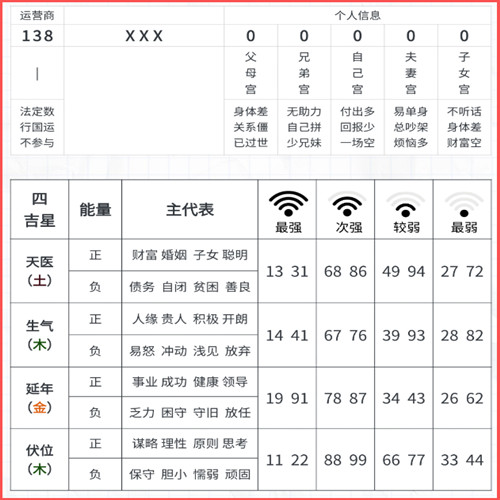 数字能量学将两个数字为一个组合,分为“八星”,即四吉星和四凶星。你需要将手机号后八位数字,从右至左每两位一组拆分(详细内容可以咨询包双龙老师免费咨询)。