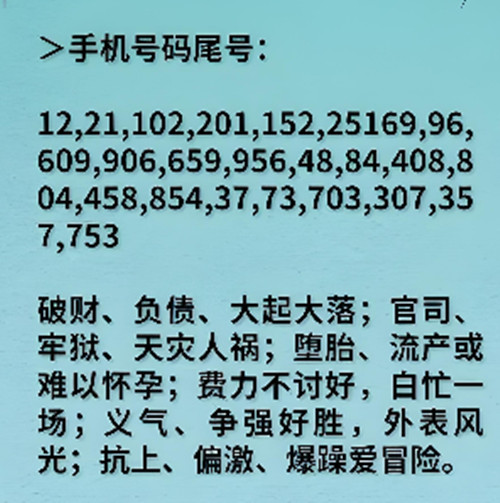 例如,尾数12、21、69、96、48、84、73、37等被认为是“绝命”磁场数字,可能带来经济困难或代表投资失败。