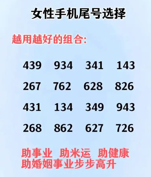 女性选择尾数为76、67、93、39、86、68、94、4 行业或酒水行业的人有利,但需注意其可能带来的桃花运问题,所以可以在手机号码中间有,尾四个数字需要吉星。