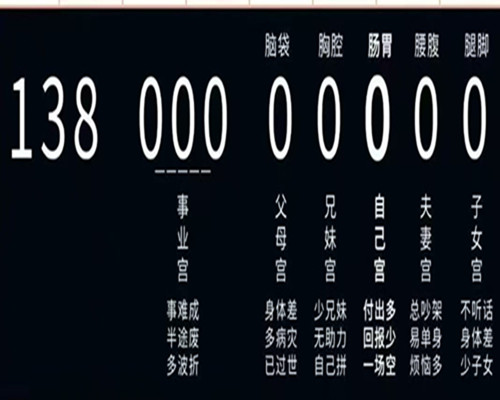 注意:严格来讲,手机号要看后八位数字的组合、转化情况,因为后八位对应12地支、八卦方位、宫位。