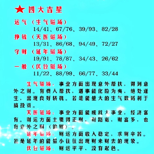 代表贵人运和人际关系,比如14、41的组合,表示使用者的人缘较好,遇到困难时容易得到贵人相助,能逢凶化吉,包双龙老师的数字能量学通过无数个案例发现一个生气磁场的缺点,“强生气”磁场的人总有生气的事情发生,也可以说气性大。