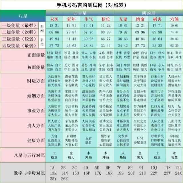 一些人相信,不好的手机号码可能会对健康和安全产生负面影响。例如,上面“手机号码测吉凶自查表”图中凶星结尾都会影响健康!